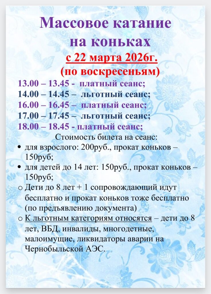 Массовое катание на коньках с 22 марта(воскресенье)